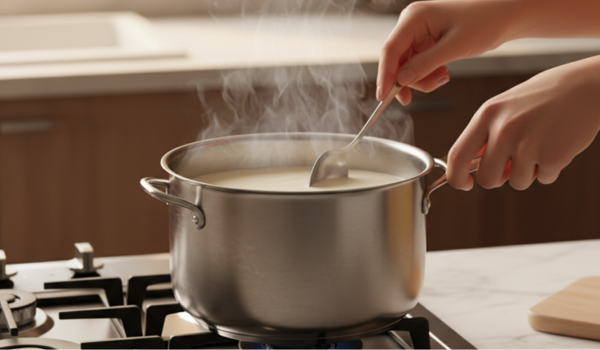 Đổ sữa tươi vào nồi, đun trên lửa liu riu và khuấy đều tay để tránh sữa bị cháy khét. Khi sữa đạt khoảng 40 – 45 °C (ấm vừa phải, không quá sôi), tắt bếp và để nguội bớt.